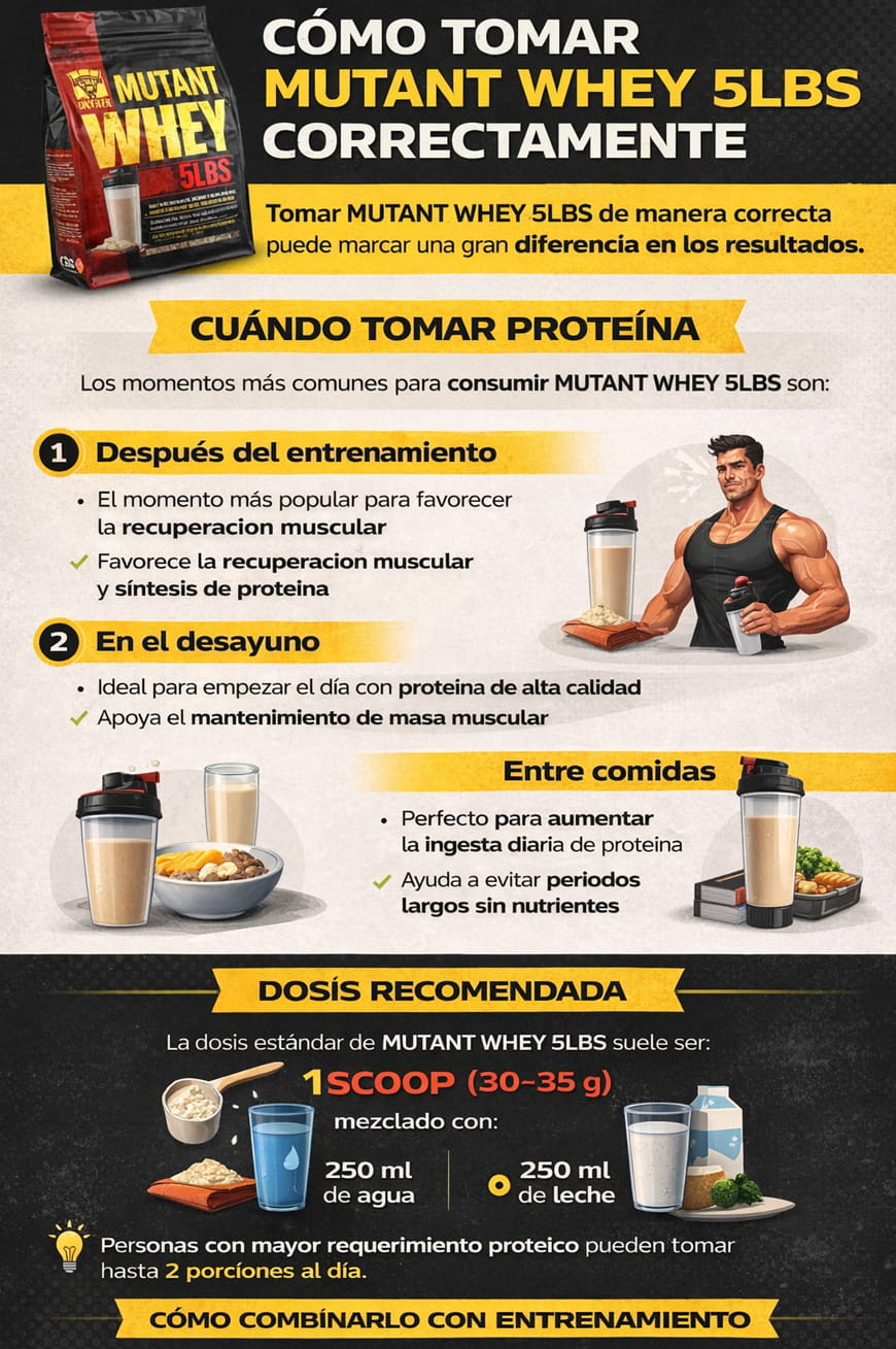 Este perfil nutricional hace que MUTANT WHEY 5LBS sea adecuado tanto para etapas de volumen como para mantenimiento muscular.