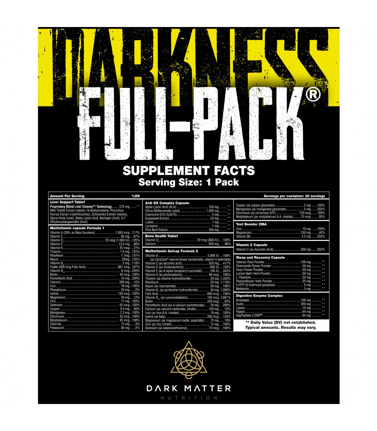 DARKNESS FULL-PACK 30 PACKS DE DARK MATTER El Mejor y Más Completo Multivitamínico, Potenciador Físico y Mental que Existe en el Mercado. Cubre los requerimientos de Atletas de Elite, y puede ser utilizado por cualquier persona en el ámbito Fitness. Full-Power, Full-Recovery, Full-Gains, todo en uno, Darkness Full-Pack. Darkness Full-Pack cubre de manera integral los aspectos de salud, rendimiento, recuperación y desarrollo de un Atleta, por medio de su composición única: LIVER SUPPORT. El hígado es uno de los órganos más importantes de nuestro cuerpo y tiene un papel fundamental en la eliminación de toxinas y la producción de proteínas esenciales. Full-Pack contiene sustancias que ayudan a proteger y mantener la salud del hígado. MULTIVITAMÍNICO FORMULA 1 Y 2 (2 TABS).